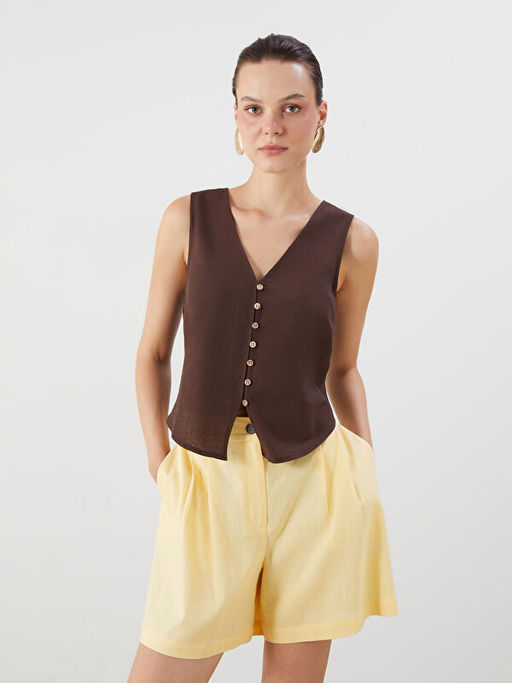 • V Yaka Keten Kar???ml? Kad?n Klasik Yelek