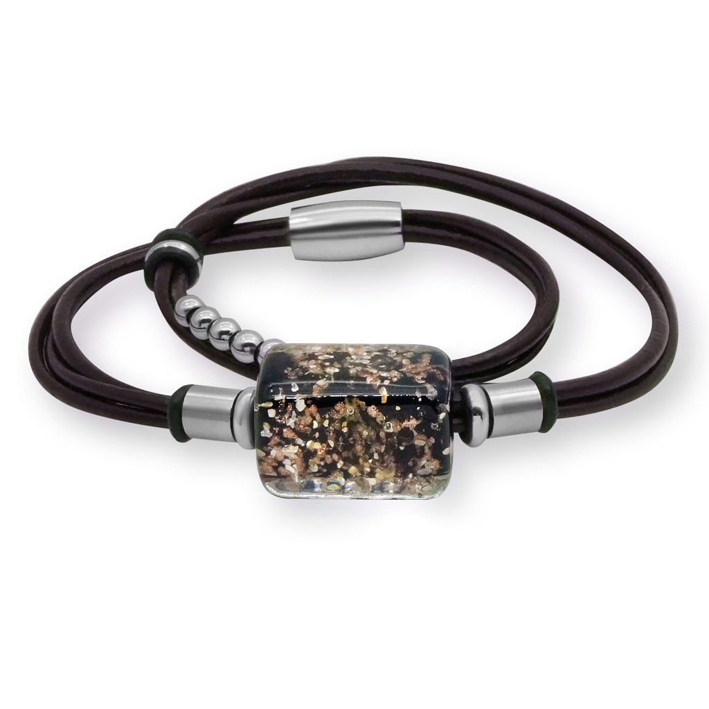 Браслет изготовлен из муранского стекла, натуральной кожи и гипоаллергенной ювелирной стали, что очень важно для людей с чувствительной кожей. Металл не темнеет и не подвергается воздействиям окружающей среды, надолго обеспечивая красивый внешний вид изделия. Крепкий магнитный замок надежно фиксируется на запястье. Ширина браслета - 1,5 см. Размер стеклянной бусины - 1,4x2,3 см. Вес - 17 гр.