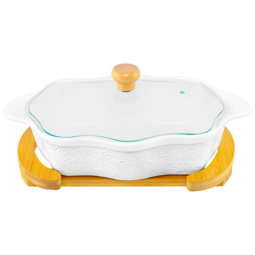 Блюдо д/запекания и сервировки 1,5 л 32*20*14 см "Розы" овал. ажур., стекл крышка на дер. подставке