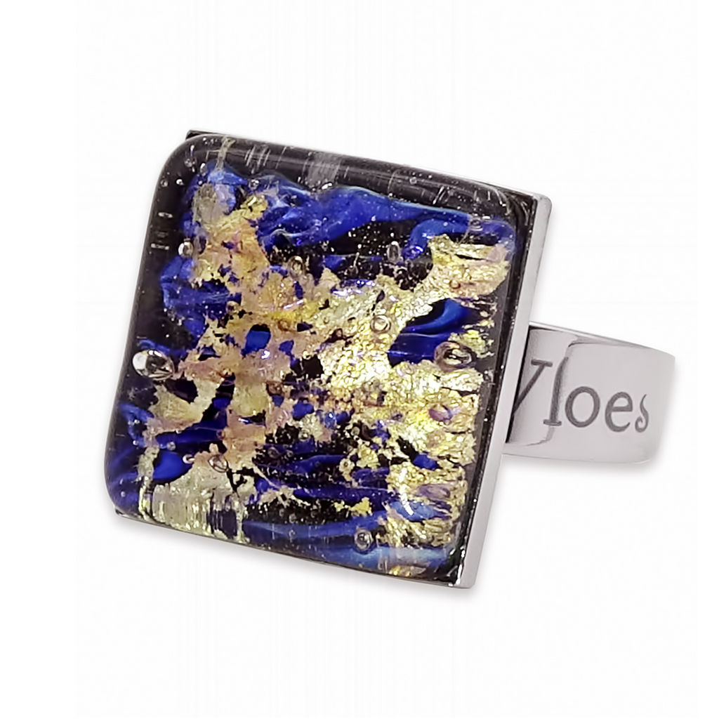 Кольцо изготовлено из муранского стекла и гипоаллергенной ювелирной стали, что очень важно для людей с чувствительной кожей. Металл не темнеет и не подвергается воздействиям окружающей среды, надолго обеспечивая красивый внешний вид изделия. Размер стеклянного элемента - 1,6*1,6 см. Кольцо безразмерное, регулируется с 16 до 19 размера. Вес - 5 гр.