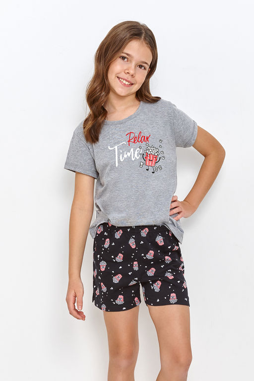 Серая пижама для девочек-подростков Relax из шорт и футболки. Футболка с коротким рукавом и принтом на груди. Шорты из 100% хлопка с милым принтом на мягкой и комфортной резинке. Идеально подходит для сна и в качестве домашнего комплекта.­