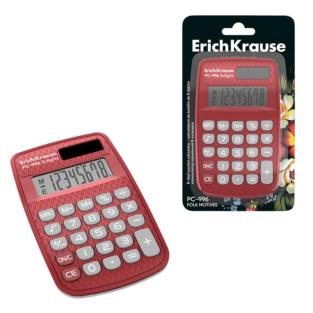 АКЦИЯ Цена за 1 шт. Калькулятор карманный 8-разрядов ErichKrause PC-996 Folk Motives, красный (в блистере по 1 шт.)