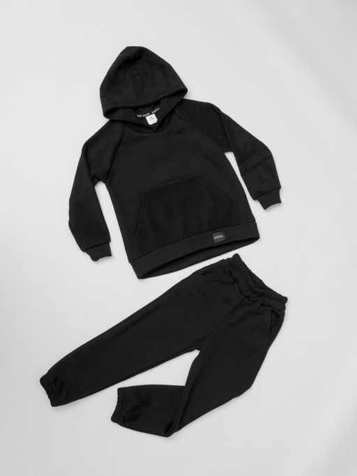 В костюм входит толстовка с капюшоном, рукава кроя реглан, карман на толстовке, брюки  с подгибкой на резинку, без карманов на брюках.