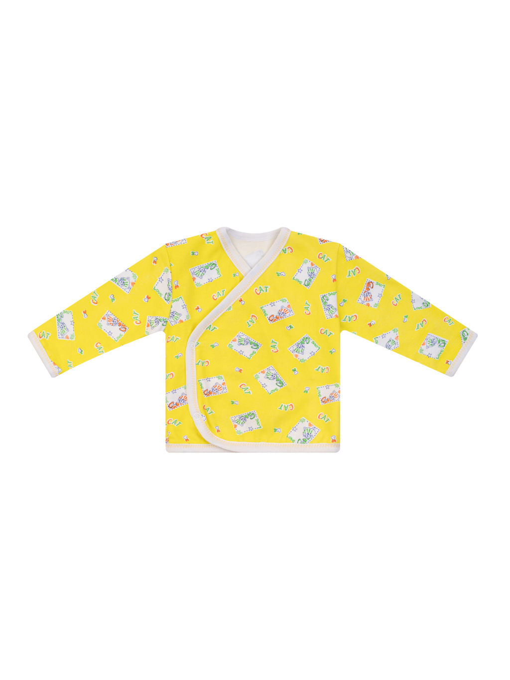 Трикотажная кофточка-распашонка с открытыми ручками из мягкого и теплого трикотажа лимонного цвета с принтом котики. Хорошо переносит частую стирку и носку. Застёжка спереди на кнопку, край обработан трикотажной бейкой.