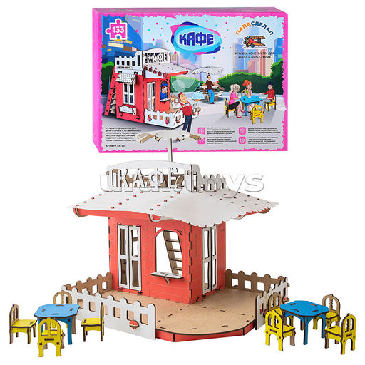 Кафе с верандой, мебелью, зонтом и лестницей. Серия изготовлена из древесного материала ХДФ, окрашенного краской на водной основе. Конструктор позволит развить мелкую моторику, воображение и память ребёнка, а также станет прекрасным подарком.