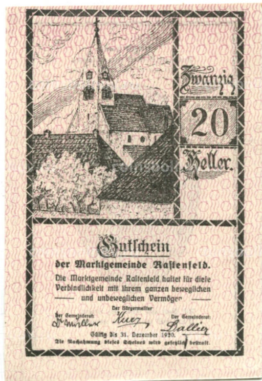 • Банкнота 20 геллеров 1920 года Австрия  Растенфельд (нотгельд)