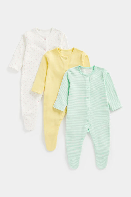 Детали: Длинный рукавКонтрастная бейкаВшитые рукавички-антицарапки в размерах до 68 смБезникелевые кнопки во всю длину спередиЦветная безникелевая кнопка для обозначения начала застегиванияЗакрытый носокНескользящая подошва в размерах с 80 смТехнология обработки внутренних швов Toe-SafeСпециальная обработка ткани для сохранения мягкости после стиркиКомбинезон 1: узор в горошекКомбинезон 2: однотонный, желтыйКомбинезон 3: узор в полоску