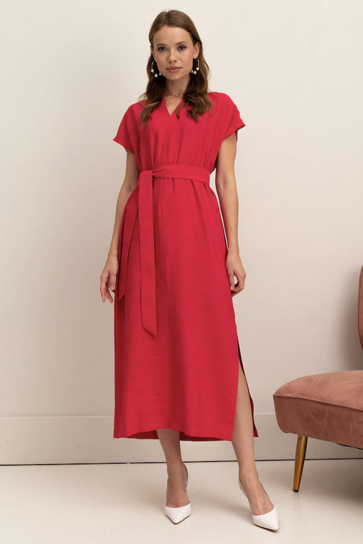 Платье из вискозной ткани с крэш-эффектом. Свободный силуэт, с разрезом в боковом шве. По центру передней и задней части изделия выполнен шов. Цельнокроеная стойка, переходящая в V-образный вырез горловины, визуально делает фигуру стройнее. Цельнокроеный короткий рукав. В комплекте пояс из основной ткани.
