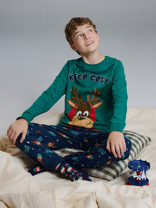 Bisiklet Yaka Y?lba?? Temal? Erkek ?ocuk Pijama Tak?m?