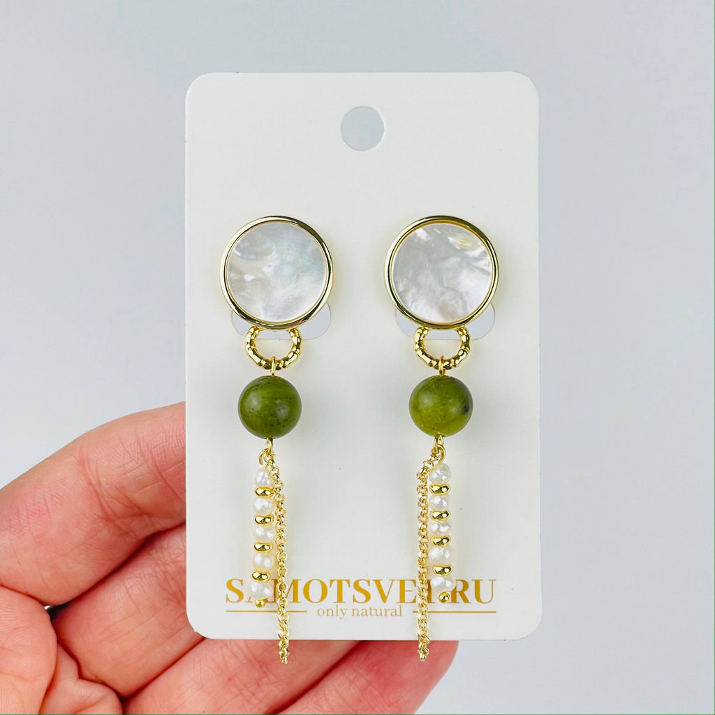 • Серьги длинные из Жемчуга, Змеевика и Перламутра