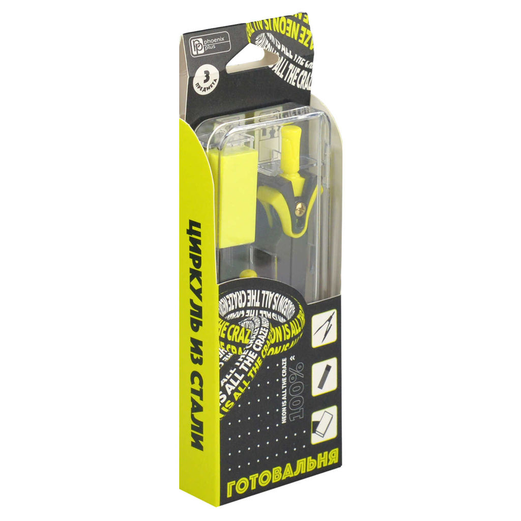 Циркуль в комплекте со сменными грифелями и ластиком , НЕОНОВЫЙ ЖЕЛТЫЙ арт.62701/ 24 НЕОНОВЫЙ ЖЕЛТЫЙ ( Макс. диаметр окружности: 23,4 см, 5,2х12,8х1,6 см, длина циркуля 11,7 см, шелкография в одну краску, футляр из полипропилена, картонная коробка).