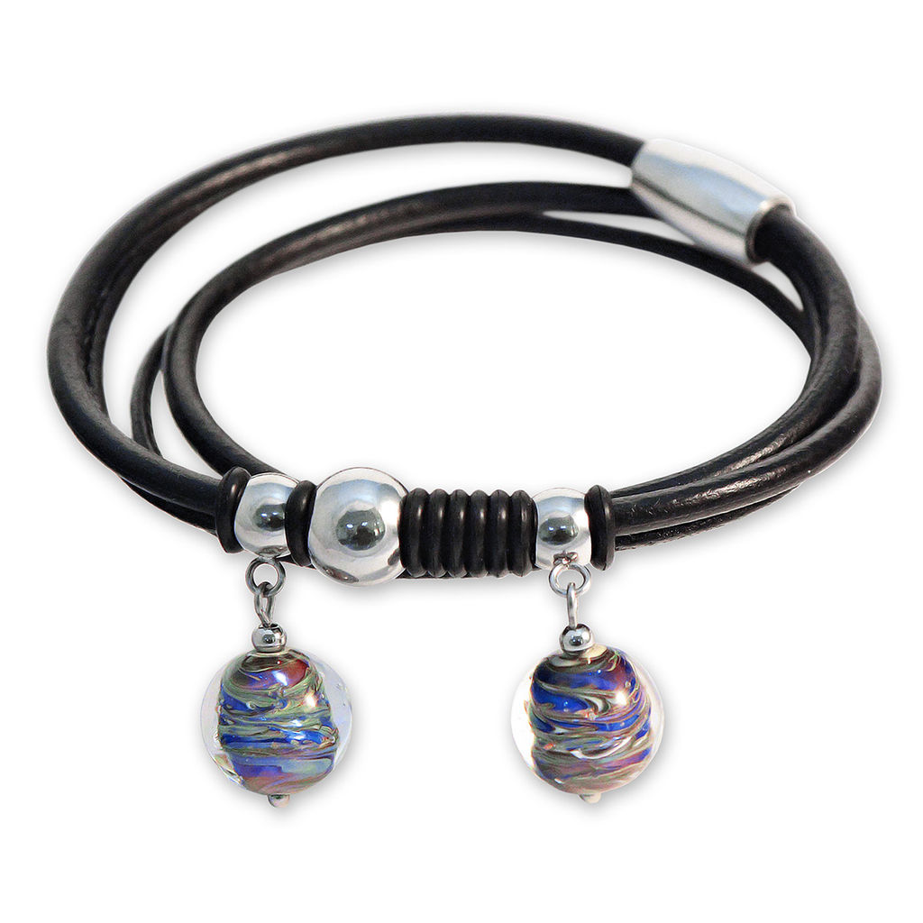 Браслет изготовлен из муранского стекла, натуральной кожи и гипоаллергенной ювелирной стали, что очень важно для людей с чувствительной кожей. Металл не темнеет и не подвергается воздействиям окружающей среды, надолго обеспечивая красивый внешний вид изделия. Крепкий магнитный замок надежно фиксируется на запястье. Ширина браслета - 1 см. Диаметр стеклянных шариков - 1,2 см. Вес - 20 гр.
