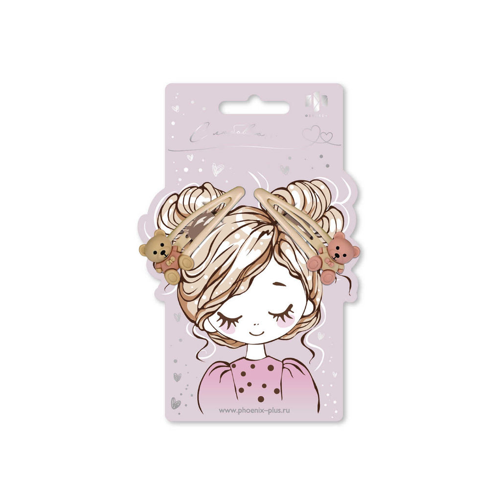 Набор заколок для волос клик-клак, глянцевые, арт. 71747 / 10 МИШКИ (в наборе: 2шт., 5,5 см, черный металл, полиэфирная смола, цвет: бежевый, подложка из мелованного картона + ПЭТ-пакет с европодвесом)