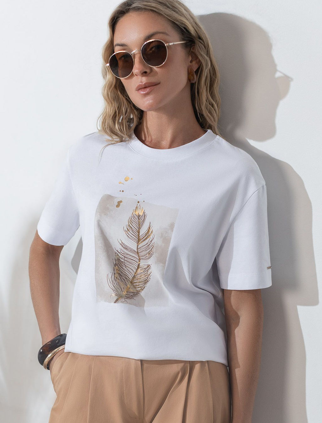 Модная футболка белого цвета привлекает внимание своим интересным дизайном и ярким принтом. Благодаря прямому крою изделие комфортно садится на любую фигуру, в том числе на большие размеры, и не сковывает движений. Круглый вырез подчеркивает современный стиль, а натуральный материал из хлопка с добавлением эластана обеспечивает удобство в повседневной носке и приятные тактильные ощущения. Прочность и износостойкая структура позволяют сохранять свежий внешний вид после множества стирок. Принт в виде пера нанесен красками с устойчивым покрытием.Стильная футболка гармонично вписывается в любой гардероб и подойдет для прогулок, отдыха или неформальных встреч. Благодаря особенностям кроя модель хорошо сидит, скрывая недостатки и подчеркивая достоинства. Яркая футболка идеально сочетается с базовыми вещами, позволяя создавать новые интересные образы каждый день.­