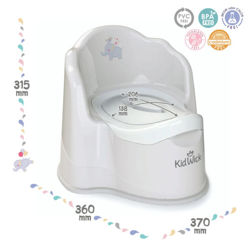 Универсальный детский горшок Kidwick «Королевский» подходит как мальчикам, так и девочкам. Увеличенный размер, высокая спинка и анатомическое сиденье со специальными выемками под ножки обеспечивают малышу максимальный комфорт. Благодаря прорезиненному основанию он не скользит по гладкой поверхности. Kidwick «Королевский» выглядит стильно благодаря сочетанию рельефного корпуса с матовыми вставками, обтекаемой формы, пастельной цветовой гаммы и нежного принта. Его легко содержать в чистоте: после использования достаточно вынуть съемную чашу и помыть ее отдельно. Горшок Kidwick «Королевский» имеет гигиеническую крышку.