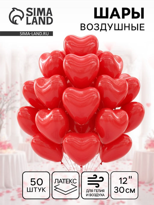 Воздушные шары латексные 12" Сердце, 50 шт., красные