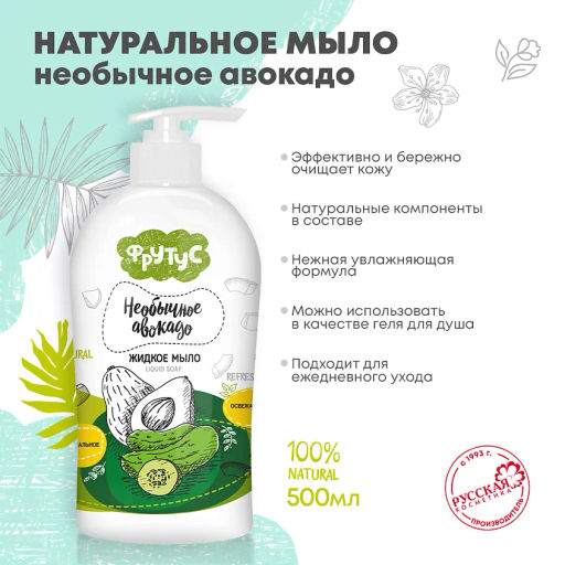 Питательное и натуральное мыло для рук «Фрутус» с авокадо превратит ваш ежедневный уход в момент истинного наслаждения и заботы о коже. жидкое Нежное мыло с дозатором для рук очищает кожу, создавая объёмную, густую пену, а натуральное масло авокадо и огуречная вода, в его составе, оказывают восстанавливающее и противовоспалительное действие, устраняют сухость и стянутость. Д-пантенол активно ухаживает и делает кожу упругой и шелковистой.