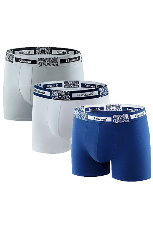 Комплект из 3-х трусов белого, темно-синего и серого цвета. Классические боксеры UNICONF из премиального гипоаллергенного хлопка с добавлением эластана. Брендированная пришивная резинка gothic style обеспечивает терморегуляцию и комфортное прилегание к телу. Усиленная передняя панель, вшитая ластовица и отсутствие боковых швов делают изделие устойчивым к стиркам и продлевают срок использования. Модель не заметна под одеждой, имеет анатомически правильный крой, что в сочетании с инновационными технологиями обработки швов позволяет сделать фигуру визуально более подтянутой и спортивной.­