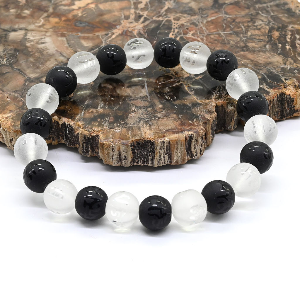 • Браслет с мантрой из хрусталя и агата черного шарик 10мм, 18см Радуга камня