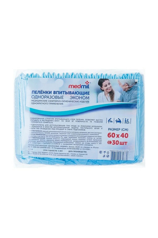 Пелёнки впитывающие одноразовые предназначены для дополнительной защиты постельного белья, матрасов, мебели, при уходе за младенцами, пациентами с ограниченными возможностями, престарелыми людьми. - при проведении гигиенических процедур, массажа, принятии "воздушных ванн" - во время сна, при смене подгузника, при кормлении - в домашних условиях, на прогулке, в поездке, в лечебно-профилактических и социальных учреждениях. Пелёнки защищают постельное бельё от промокания, а кожу пациента от мацераций и пролежней. Облегчают уход, повышают комфорт для пациента. Пелёнки Медмил не уступают лучшим импортным аналогам.