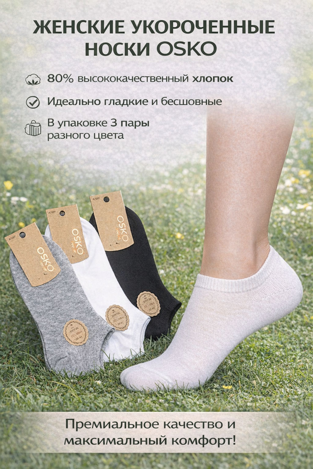 OSKO носки женские укороченные однотонные бесшовные выполнены из высококачественного хлопка с добавлением лайкры.