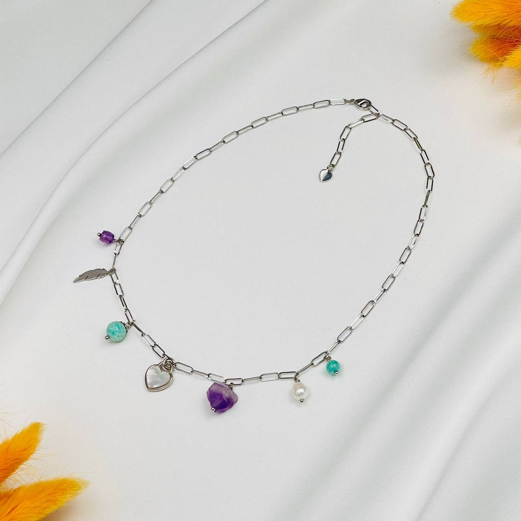 • Колье на цепочке с Амазонитом, Аметистом, Жемчугом и Перламутром 38/45 см