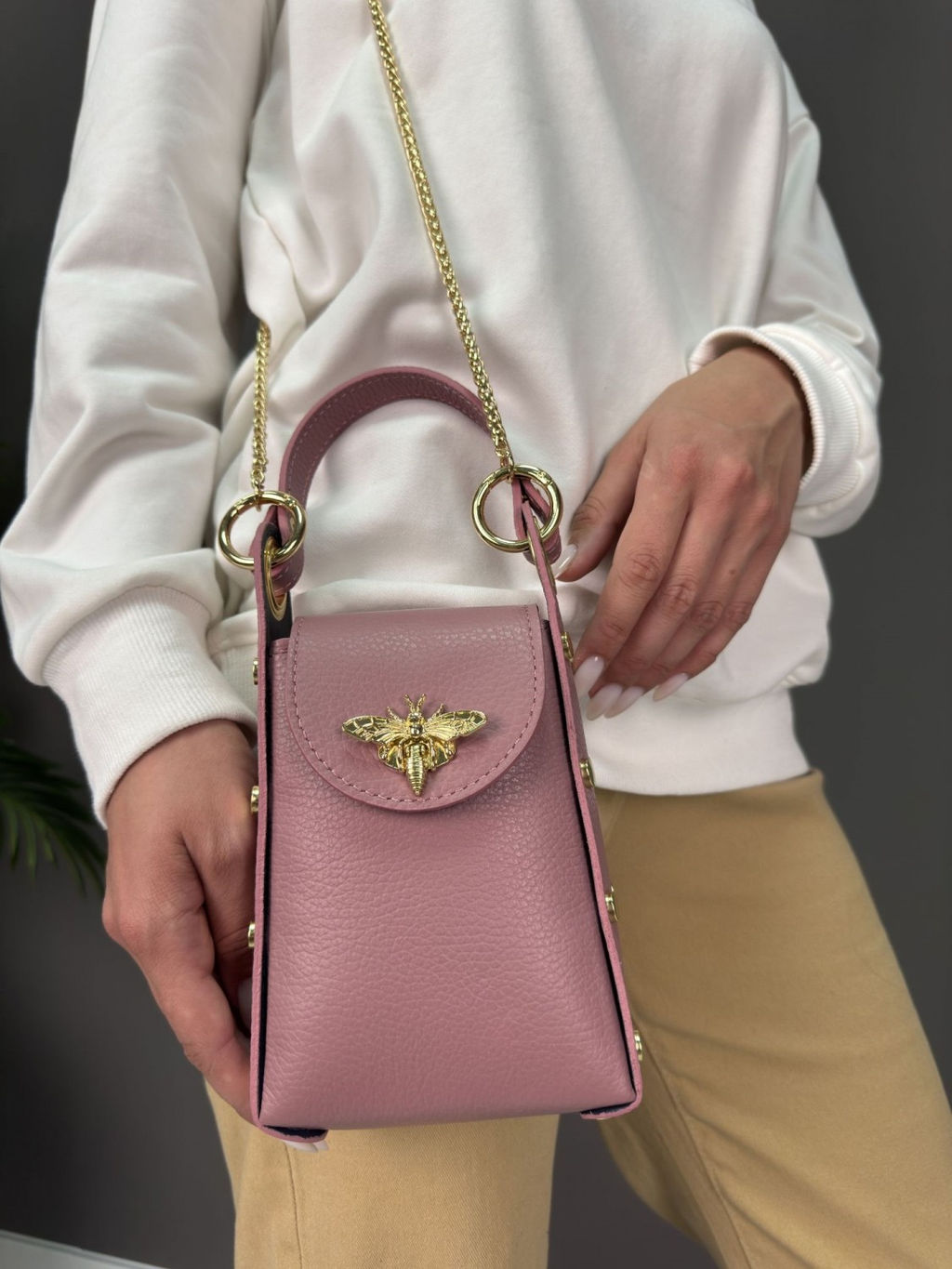 Страна: Италия Акции: Товары со скидкой Производитель: Pelletteria Luisa, Italy Размер: маленькая Стиль ношения: на ремешке через плечо Форма: жесткая Выделка кожи: зернистая износостойкая Цвет кожи: Розовый Оттенок: пыльная роза Палитра цветов: TB-105944 Dollaro Размеры: длина: 13 см \tвысота: 21 см \tширина: 6 см Описание: Красивая аккуратная необыкновенно модная женская сумка кросс-боди из натуральной кожи. Тренд 2025 года, Базовая коллекция Sefaro, Италия. Особенности сумки: замок в виде золотой бабочки, плечевой ремень-цепочка, а также заклепки на боковых стенках сумки - фурнитура высокого итальянского качества. Все эти элементы непременно привлекут к вам внимание окружающих своей яркостью и оригинальностью исполнения. Сумочка имеет каркасную форму, компактная, выполнена из зернистой телячьей кожи, может использоваться как повседневная модель, но подойдет и для торжественного случая - элегантно дополнит вечерний образ по типу клатча, либо подчеркнет сдержанный лук. Закрывается сумка на крышку с застежкой, внутри один отдел, в котором поместится всё самое необходимое. На дне сумки металлические защитные ножки. Можно носить в руке, либо на изящной цепочке через плечо (длина 110см) - очень удобно!