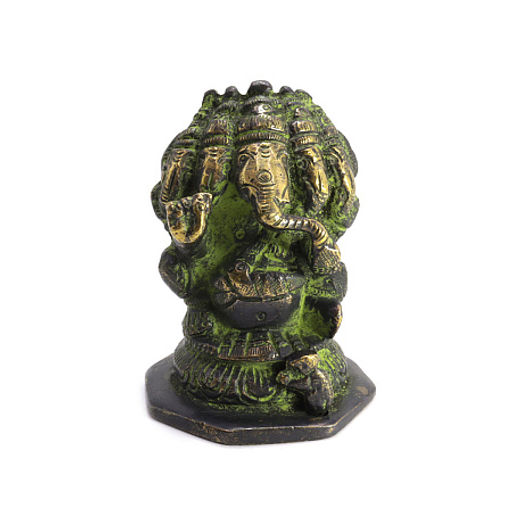 Эта редкая и впечатляющая фигурка изображает Ганешу с пятью головами мощное и глубоко символичное воплощение божества, наделённого всесторонним зрением, всеведением и многогранной мудростью. Пять голов Ганеши олицетворяют пять основных качеств сознания: чистоту, блаженство, волю, знание и действие, а также способность видеть и управлять всеми направлениями пространства и времени одновременно.