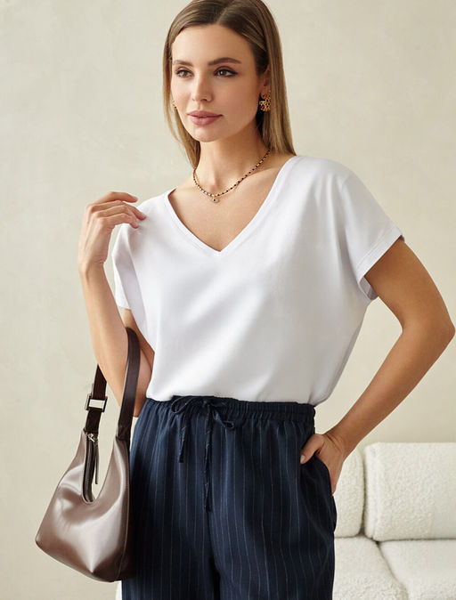 92%Хлопок 8%ПУ Футболка с цельнокроеным рукавом выполнена из премиального хлопка. Базовая однотонная модель идеально впишется в любой гардероб. V-вырез подчеркивает ключицы и удлиняет шею, хорошо сочетается с жакетами или кардиганами. Изделие дополнено металлическим логотипом бренда.