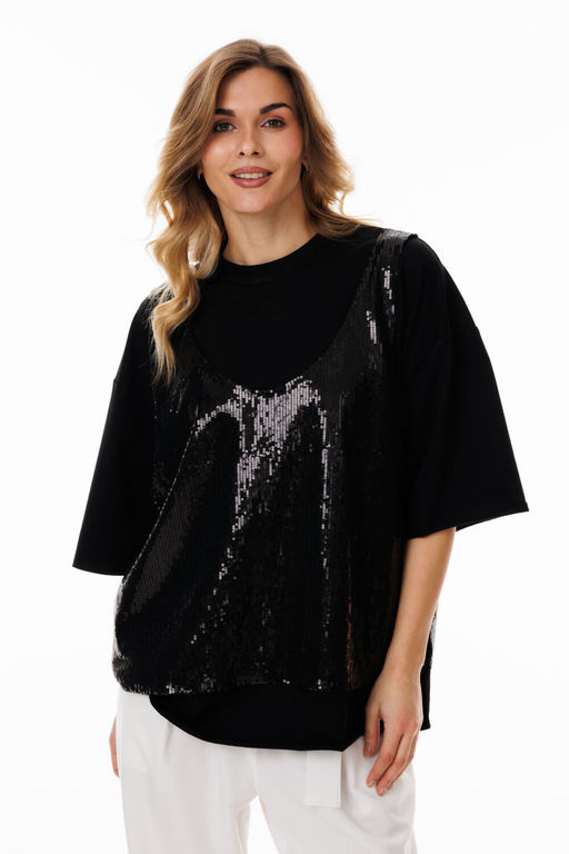 Состав: Футболка: Хлопок-95%; Эластан-5%; Топ: ПЭ-96%; Эластан-4%; Стильный блузон, состоящий из тандема: футболка+майка в стиле oversize. Блузон свободного силуэта со спущенной линией проймы и укороченным втачным рукавом длиной 26 см. Горловина округлая, оформлена планкой 2,8 см. Длина блузона по спинке 65-68 см (в зависимости от размерного ряда). Низ изделия и рукавов обработаны открытым срезом. Верхние детали изделия отлетные и имитируют силуэт майки без рукавов и состоят из мерцающего трикотажного полотна с пайетками. Низ изделия и рукавов обработаны открытым срезом. В плечевых и боковых швах детали верхнего изделия закреплены. Горловина спинки и переда майки имеют округлые глубокие вырезы. Верхние детали майки короче основного изделия на 6-7 см. Длина изделия по спинке 48 см. Особые рекомендации: рекомендуется холодная деликатная ручная стирка, без использования отбеливающих СМС, без интенсивного трения. Сушка в вертикальном положении. ВТО с минимальным паром. -- Характеристики -- Состав: Футболка- Хлопок-95%; Эластан-5%; Топ- ПЭ-96%; Эластан-4%; Сезон: Весна Рост: 164 Страна бренда: Беларусь