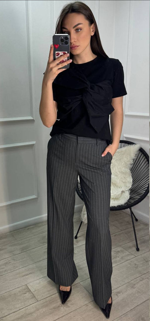 44 Брюки: Высота посадки - 27см, Длина брюк без пояса - 105см, Длина по внутреннему шву - 81.5см, Ширина брючин сверху - 67.5см, Обхват брюк по низу - 61.5см, Ширина по бедрам - 50см, Ширина по талии - 37см;
