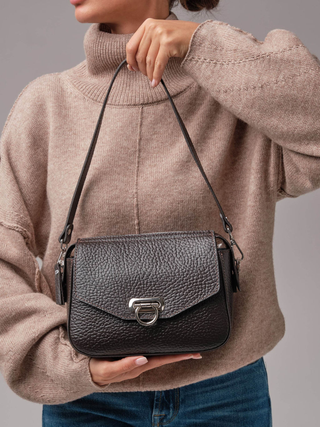 Кожаная женская сумка Azaro 3684 темно-коричневый соло - стильная и современная модель, выполненная из плотной, фактурной натуральной кожи с выразительным зернением. Материал выглядит дорого, отлично держит форму и устойчив к носке. Форма сумки лаконичная и аккуратная, что делает её универсальной для любых образов - от повседневного до более элегантного. Темно-коричневый цвет всегда актуален: он подчеркивает фактуру кожи и легко сочетается с любой одеждой. Металлическая фурнитура в холодном серебристом оттенке придает модели современный характер. Стильная застежка одновременно выполняет декоративную и функциональную роль. Женская сумка Azaro 3684 темно-коричневый соло продается в комплекте с 2 ремнями - удобным коротким для ношения в руке или на плече, а также длинным, который позволяет носить ее через плечо как кросс-боди. Это делает модель практичной и адаптируемой под разные ситуации. Это стильная, продуманная и универсальная сумка, которая станет стильным акцентом и легко завершит любой образ. -- Характеристики -- Тип товара: Женские сумки Цвет: темно-коричневый соло Материал: Натуральная кожа Бренд: Azaro Тип: Сумка на плечо, Сумка через плечо Страна-изготовитель: Россия Высота, см: 18 Ширина, см: 22 Глубина, см: 9 Материал подкладки: Хлопок Количество внутренних отделений: 1 Количество внешних карманов, шт: 2 Тип застежки: Молния, Зажим Формат А4: не вмещает Высота ручек, см: 23 Длина плечевого ремня, см: 116 Вес товара, г: 570 Ручки: На плечо, На локоть, Плечевой ремень Пол: женская коллекция Группа товара: Сумки Выгружать товары на сайт: Да