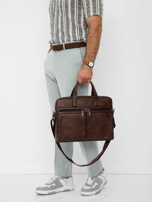 Мужской портфель выполнен из экокожи. Дополнен серебристой темной фурнитурой. Данная модель закрывается на молнии. Каркас полужесткий. Носится в руке за встроенные ручки или на плече. В комплекте имеется съемный ремень.