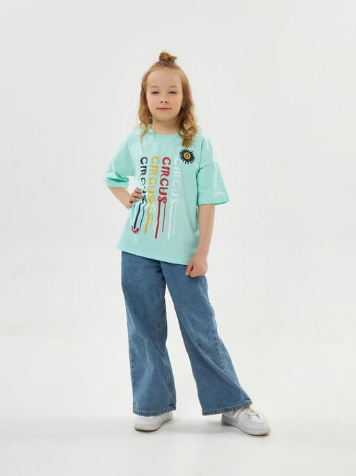Изделие прямого кроя со спущенным рукавом. Вырез горловины округлый, неглубокий. Декорирована футболка принтом. Тип ткани-Кулирная гладь (супрем).­