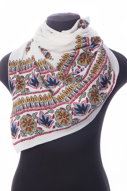 Нарядный палантин из полупрозрачного крепа. На белом фоне яркие стилизованные букетики. Такой аксессуар станет Вашим любимым вне зависимости от сезона.