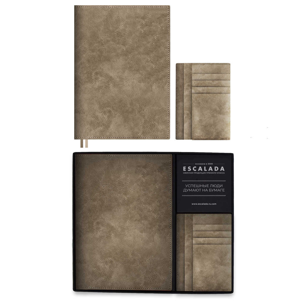 Ежедневник недатированный + картхолдер (набор подарочный) ESCALADA, А5+, 160 л., арт. 70568/ 10 ФЛАНСТЕР БЕЖЕВЫЙ (кожзам: ежедневника: 175x245 мм, картхолдера: 100х140 мм, мягкий переплёт, запаянный край, материал обложки: искусственная кожа "Фланстэр"; способ крепления блока: ниткошвейный; декор: блинтовое тиснение; вн. блок: 160 л., кремовый офсет 80 г/м?, печать в одну краску (клетка), справочный материал: есть; перфорация углов блока: нет; отделка среза: окрашивание пантоном; закладка/-и: два ляссе, каптал: есть; форзац: печать пантоном, особенности: карманы для визиток и документов; персонализация возможна: да; индивидуальная упаковка: подарочная картонная коробка с ПВХ-крышкой + промостикер + ПЭТ-пакет)