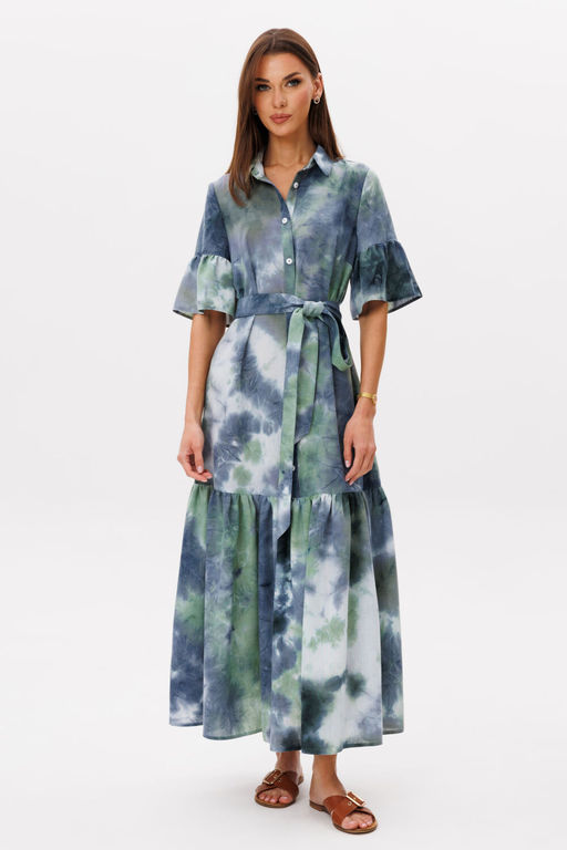 На полочке изделия расположены горизонтальные нагрудные вытачки, притачная вертикальная планка для застежки петли/пуговицы. Горловина обработана воротником рубашечного типа на стойке. Рукав втачной, одношовный, с притачной рюшей 13 см. К основе платья притачена рюша со сборкой. Длина изделия платья по спинке 130 см, длина по спинке до притачной рюши 78 см. В боковых швах платья расположены карманы. Платье дополнено съемным текстильным поясом.(фурнитура может отличаться от представленной на рекламном фотоматериале)