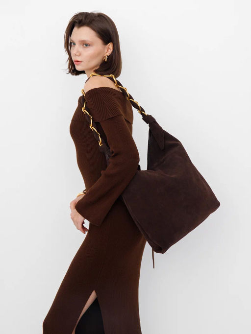 Вместительная модель, выполнена из замши. Декорирована цепочкой на ручке. Дополнена золотистой фурнитурой. Данная модель закрывается на молнию. Каркас мягкий. Носится в руке или на плече за встроенную удлиненную ручку.