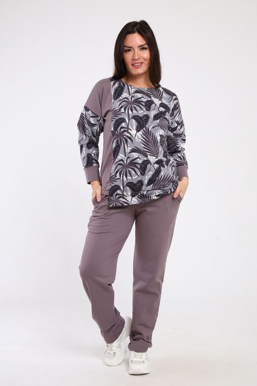 Комбинированный костюм оригинально смотрится на любой фигуре, с легкостью совмещая в себе элегантность и комфорт. Джемпер со спущенным рукавом. Брюки прямого покроя с карманами, посадка средняя. Трикотажный женский костюм предназначен для девушек, ценящих комфорт, удобство. Подойдет для прогулок в кино с друзьями, путешествий, работы в офисе, праздника, а также как вечерний модный образ на свидание.