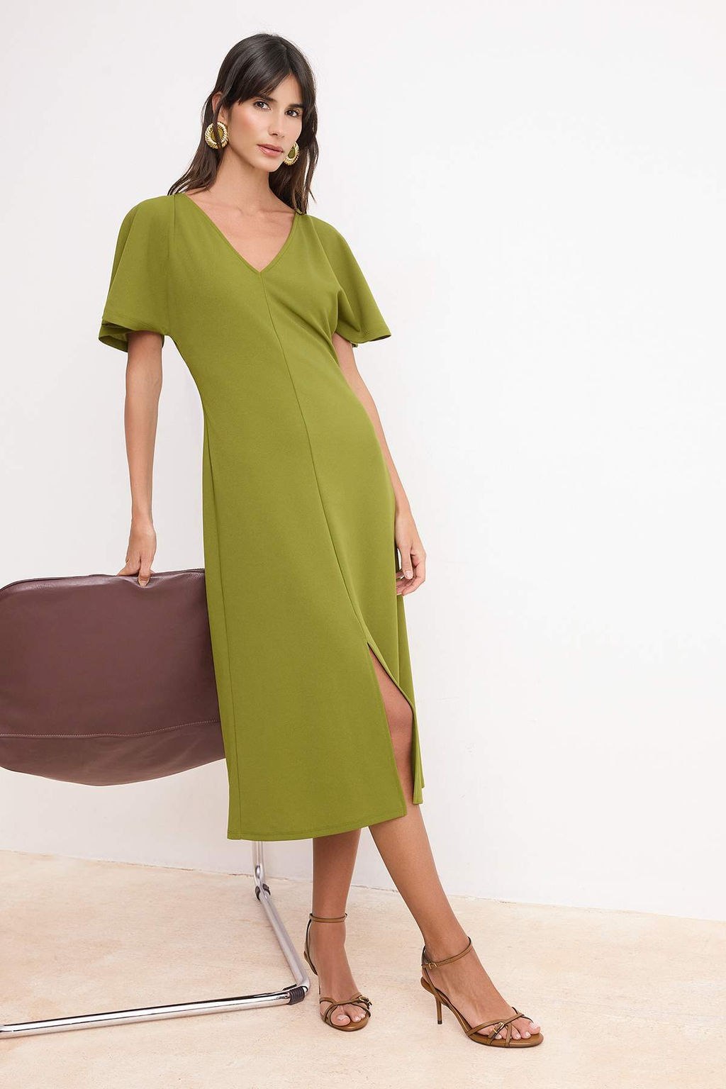 • Yag Yesil Bodycon V Yaka Melek Kol K?sa Kollu Krep Orme Elbise TWOSS26EL00471