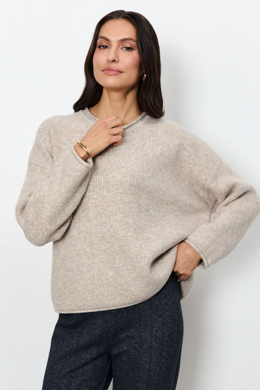 Этот джемпер воплощение комфорта и стиля. Его свободный силуэт и мягкая фактура в рубчик создают расслабленный, но элегантный образ. Длинные рукава со спущенной проймой добавляют непринужденности. Круглый вырез горловины, низ рукавов и низ изделия оформлены аккуратной резинкой с руликом. Изделие выполнено из меланжевой пряжи.