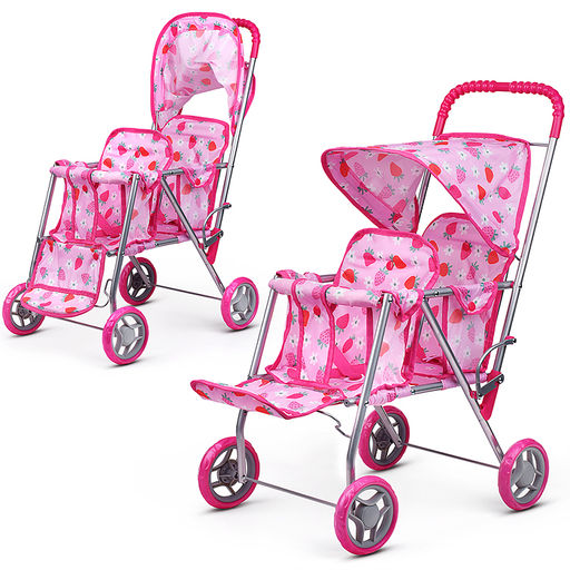 Коляска для кукол, для двойни, металлическая, складная, цвет клубнички на розовом