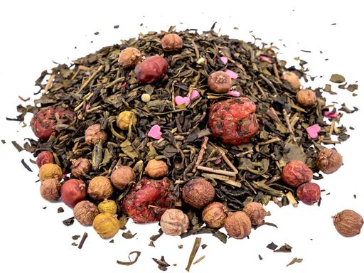 Бленд среднелистового китайского зеленого чая, ягод вишни и можжевельника, сахарных сердечек. С вишневым ароматом.