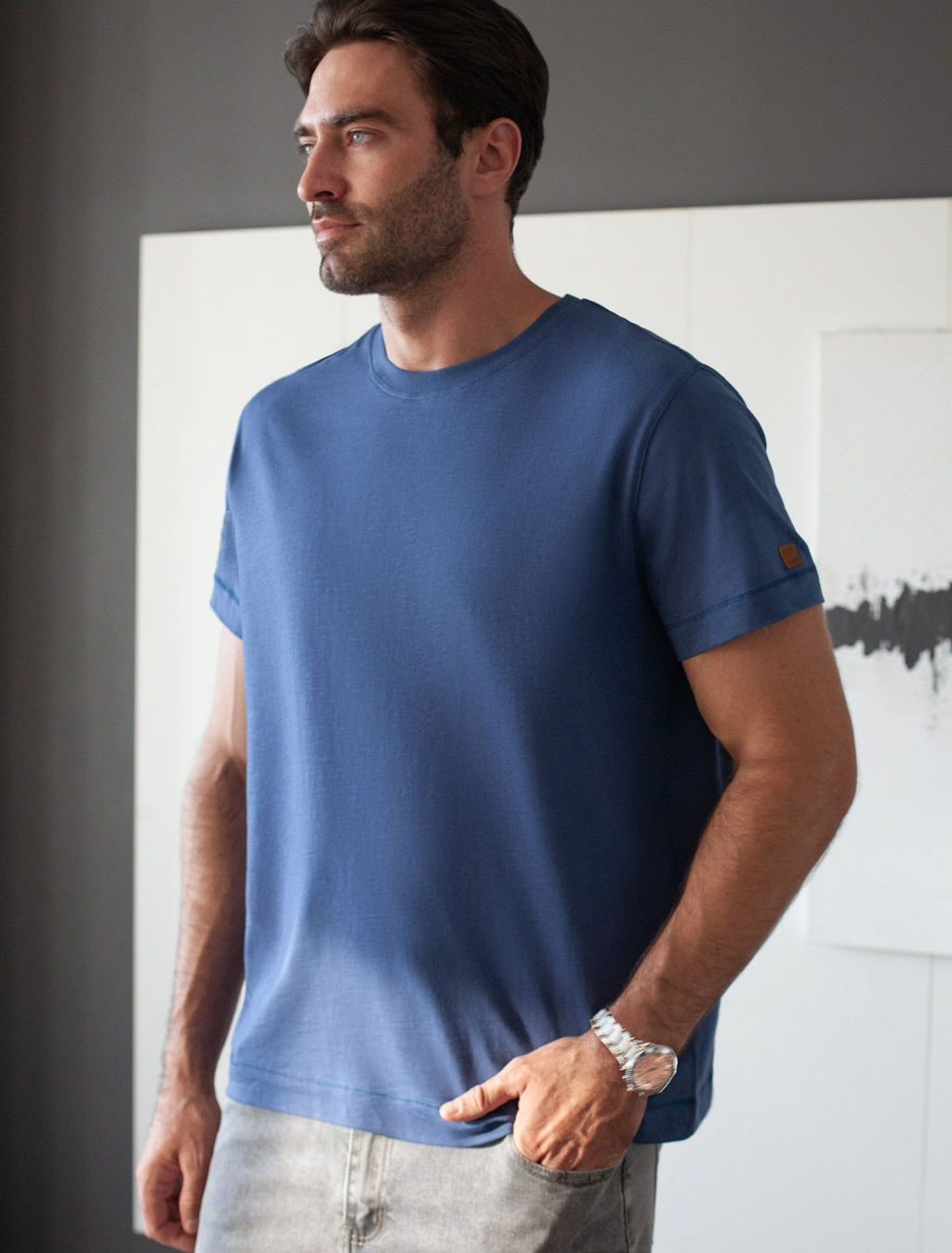 Футболка выполнена из фактурного полотна из 100% хлопка. Базовая однотонная модель, без труда впишется в любой гардероб. Ткань имеет характерный рисунок черточки за счет сочетания разных волокон хлопка 140-150 г. Хорошо держит форму и поддерживает комфортный микроклимат в течении дня. На рукаве нашивка из эко-кожи с логотипом бренда.­