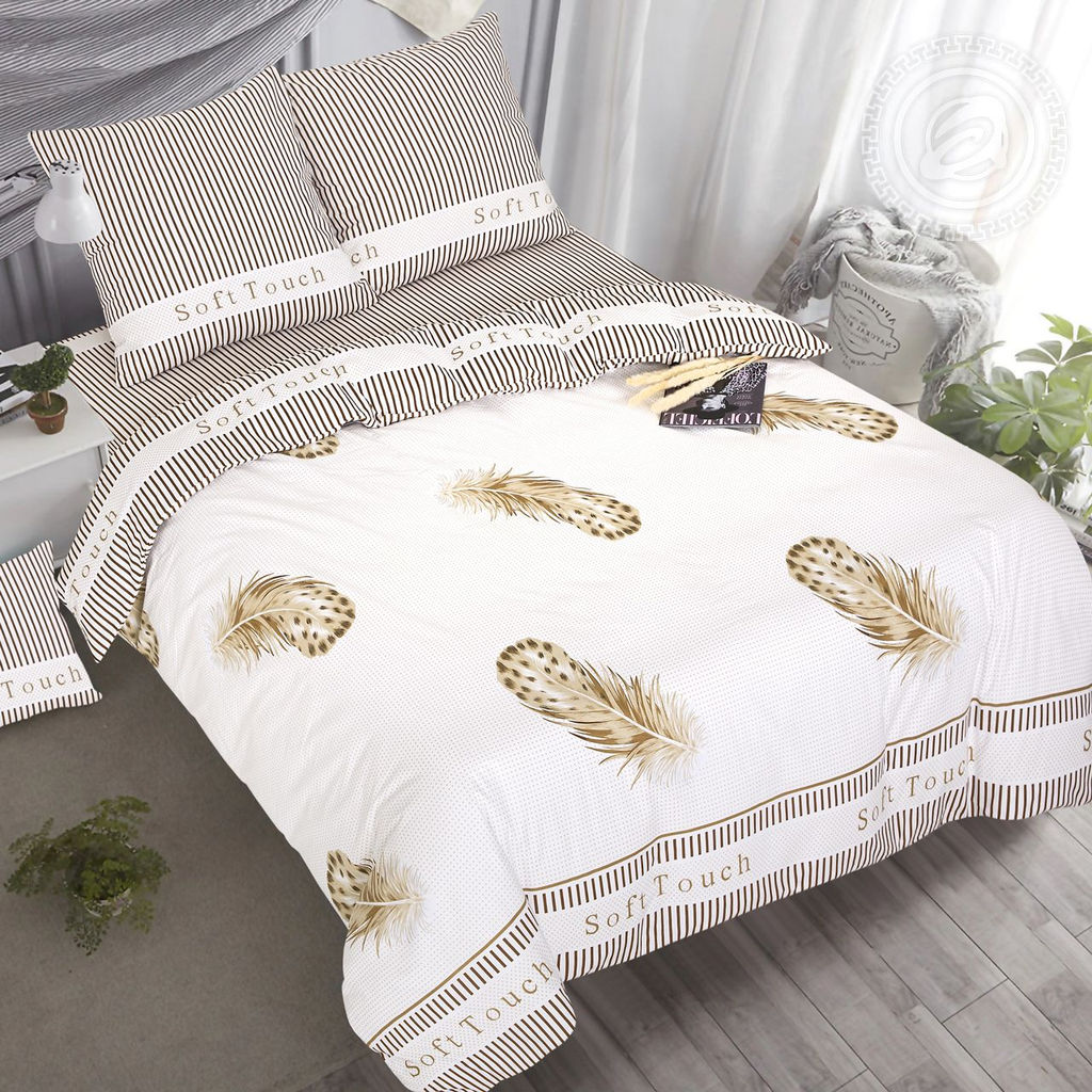 Кремово-пастельный фон рисунка заполнен сплошным точечным орнаментом. На нем свободно располагаются изящные легкие перья, выполненные в оттенках бежевого и шоколадного цвета. Бордюр рисунка отделен тонкой светло-коричневой линией и очень короткими вертикальными полосками, повторяющимися сверху и снизу. Посередине бордюра декоративная надпись на английском Soft Touch - нежное прикосновение.