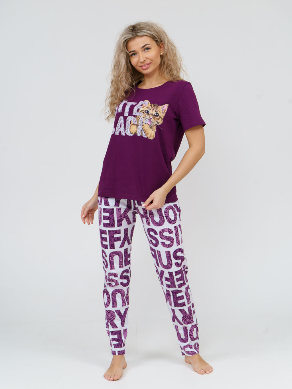 Женская пижама со штанами из 100% хлопка идеальный выбор для комфортного отдыха! Этот уютный домашний комплект состоит из стильной футболки с модным принтом и удобных брюк, которые подарят вам невероятное ощущение комфорта в любое время года. Футболка полуприлегающего силуэта с коротким рукавом и аккуратной круглой горловиной идеально облегает фигуру, подчеркивая женственность. Брюки прямого кроя слегка заужены книзу, имеют эластичный пояс для максимального удобства и практичные внутренние карманы каждая деталь продумана для вашего комфорта! Натуральный 100% хлопок обеспечивает идеальную воздухопроницаемость, гипоаллергенность и безопасность для кожи, мягкие тактильные ощущения и простоту в уходе пижама не теряет форму после множества стирок. Эта пижама станет вашим любимым комплектом не только для сна, но и для домашнего отдыха, пижамных вечеринок, романтических вечеров и летних прогулок на свежем воздухе. Подарите себе ощущение уюта и комфорта с этой прекрасной пижамой! Натуральный хлопок, стильный дизайн и продуманный крой всё для вашего удовольствия.