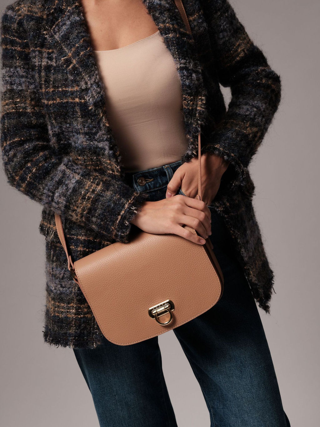 Детали: натуральная кожа, натуральная замша на внутренней стороне клапана, одно отделение на хлопковой водонепроницаемой подкладке, 1 внешний накладной карман, 1 скрытый карман между основным внутренним отделением и накладным карманом, зажим-вертушка с логотипом бренда, несъемный регулируемый плечевой ремень. Стильная сумка через плечо кросс-боди Azaro 31034 бежевая нуга станет отличным дополнением вашего образа и надежным аксессуаром для повседневной жизни. Изготовленная из натуральной кожи, она обладает высокой прочностью и долговечностью. Регулируемый плечевой ремень позволяет носить ее как кросс-боди, настраивая по удобной высоте. Плечевой ремень несъемный, но его можно убрать внутрь и носить сумку как клатч. Клапан сумки изготовлен с отделкой из натуральной замши на внутренней стенке и магнитной застежкой. Под ним расположено одно большое отделение на водонепроницаемой подкладке и боковым карманом на молнии, 2 небольших открытых отделения. Использование натуральных материалов гарантирует не только стильный внешний вид, но и функциональность. Эта сумка AZARO среднего размера позволит вам выглядеть безупречно в любых обстоятельствах. -- Характеристики -- Цвет: персиковая нуга Материал: Натуральная кожа Бренд: Azaro Тип: Сумка на плечо Страна-изготовитель: Россия Высота, см: 19 Ширина, см: 26 Глубина, см: 7 Материал подкладки: Хлопок Количество внутренних отделений: 2 Тип застежки: Зажим Формат А4: не вмещает Высота ручек, см: 56 Длина плечевого ремня, см: 120 Вес товара, г: 610 Ручки: На плечо;Плечевой ремень;На запястье;На локоть ВыгружатьНаСайт: Да Пол: женская коллекция Группа товара: Сумки