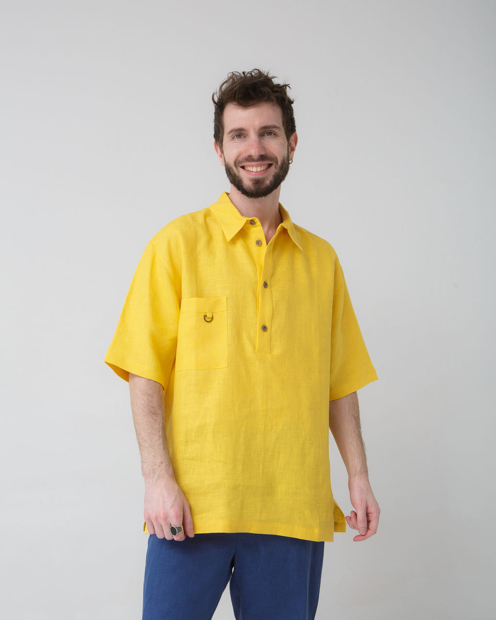 Классический крой поло с короткими рукавами и аккуратным воротником-стойкой создает гармоничный силуэт, который одинаково хорошо смотрится на любой фигуре. Стильная застежка на пуговицах из натуральных материалов подчеркивает приверженность экологичности, а фактурная льняная текстура добавляет образу благородной непринужденности.Эта летняя рубашка универсальна в сочетаниях: носите её с белыми льняными брюками для создания элегантного курортного образа, с джинсами для повседневных городских прогулок, или с шортами для пляжного отдыха. Яркий желтый цвет наполняет энергией и хорошо комбинируется как с нейтральными, так и с яркими оттенками.