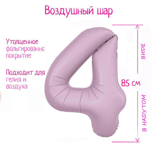 Набор: Нет. Диаметр, дюйм: 40. Рисунок: Нет. Тематика рисунка: Без рисунка. Вид шара: Цифра. Наличие клапана: Да. Цифра: 4. Надувка шара: Воздухом. Надувка шара: Гелием. Бесплатная доставка: Да.
