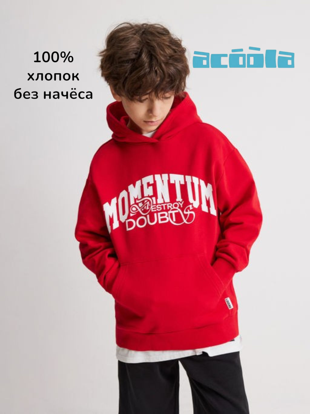 Красное худи с принтом для мальчика представляет собой яркую модель для создания стильных повседневных и спортивных образов. Худи выполнено из хлопкового футера с петлями на изнаночной стороне (без начеса), что обеспечивает комфортное ношение в теплое время года и делает модель подходящей для занятий спортом. Модель свободной посадки со спущенной линией плеча комфортно ощущается в ношении и создает объемный модный силуэт. Низ изделия и рукавов выполнен из эластичного риба для лучшего прилегания к телу. Спереди нашит накладной карман-кенгуру. Худи украшено принтом с надписью "MOMENTUM DESTROY DOUBTS" англ. - "Импульс уничтожает сомнения". Стилизуйте модель с белой футболкой и черными шортами для создания практичного и модного образа. 20110580044